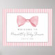 This elegant horizontal sign features a soft pink watercolor bowtie-style bow at the top, framed by cute pink and white stripes around the edges. The grey fonts combine script and serif typography for a timeless and charming look. The design includes a delicate double-line border, which can be customised by changing the background or line colours to match your baby shower theme.
