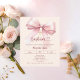 A soft cream, peach colored background, decorated with a pink large bow and, a golden cross. Personalize and add a name and details details.