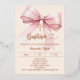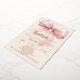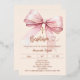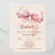 A soft cream, peach colored background, decorated with a pink large bow and, a golden cross. Personalize and add a name and details details. Real rose gold foil text.