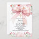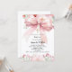 A white background, decorated with a pink large bow and, a golden cross and pink flowers. Personalise and add a name and details details.