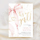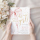 Pink Bow Elegant girl baby shower invitation. Modern minimalist design in blush pink and gold. Features trendy watercolor coquette bow, and heart script font it's a girl! Perfect for an elegant style girl shower celebration. Personalize with your own details. Printed Zazzle invitations or instant download digital printable template.