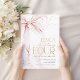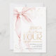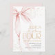 Pink bow girl's 4th birthday invitation. Modern feminine design in blush pink and gold. Features trendy watercolor coquette bow, calligraphy heart script font and modern typography FOUR. Perfect for an elegant style girl's fourth bday celebration. Personalize with your own details. Printed Zazzle invitations or instant download digital printable template.