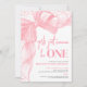 Girls Just Wanna Be ONE 1st Birthday Invitation. This adorable design features a playful watercolor bow with a ribbon frame accenting the top and left side. Behind the bow, faux pink glitter confetti is scattered around the top and left edges, adding a fun and sparkly touch while keeping the look sweet and stylish.