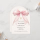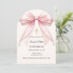 An arch shaped confirmation invitation. A soft ivory background, decorated with a pink large bow with pearls and a golden cross. Personalize and add a name and details details.