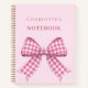 A girly notebook for school, journalling or diary. A soft, blush pink background, decorated with a large checked bow. Personalise and add a name.