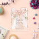 Blush pink watercolor coquette bow is decorated with roses and sage green greenery. A gold cross is placed above the text. The back is a chic pink and white stripe pattern. Your daughter's name is written in a beautiful calligraphy script. All text is editable.