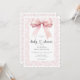 Celebrate the upcoming arrival of a sweet baby girl with this charming baby shower invitation! Featuring a delicate pink and white floral toile background and elegant white scalloped edges, this invite is as lovely as the occasion itself. A soft watercolor bow crowns the top, while a playful, heart-accented font adds a whimsical touch. Feminine, graceful, and full of joy—this invitation sets the perfect tone for a shower filled with love and celebration. Created by Simply Farmhouse Press.