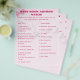 Design features a light pink background to the image of a pink bow amid white puffy clouds. Heading is displayed in bold pink. Directions appear just below heading and are featured in a clear, easy-to-read print. Customer is given the option to use the provided authors and titles or customize your own! Answers to the game are as follows: 1.C, 2.J, 3, G, 4.E, 5.H, 6.A, 7. B, 8.D, 9.I, 10, F