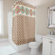 Upgrade your bathroom with this fun mod shower curtain featuring a retro 70s style geometric small squares pattern in vintage shades of coral pink, aqua blue, and brown with a row of large groovy flowers at the top.