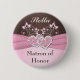 This personalised pink and brown floral Matron of Honour button with a PRINTED pink ribbon and a pair of PRINTED FAUX glitter and diamond jewel joined hearts brooch on it matches the wedding invitation shown below. The text is customisable and so is the shape and size of the button. ****PLEASE note that if you change the shape the text may get cut off. It will print as it appears on your monitor, and you must allow adequate space around the edges, so do NOT run text right up to the edge. If you need anything changed, please email niteowlstudio@gmail.com.