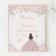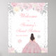 This elegant and glamourous winter sweet sixteen welcome sign features a beautiful princess with brunette hair and fair skin in a pink ball gown. The text combines handwritten script and modern sans serif fonts for a classy and sophisticated look. The floral arrangements, snowflakes and silver confetti create the perfect blend of rustic and chic.