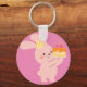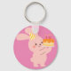 A pink bunny wears a party hat and carries a cup cake with candles on it keychain.  Great as a party favour for all your guests.