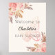 A welcome poster for a Baby Shower, celebrating a baby girl. A soft beige background decorated with pink roses, florals, pampas grass and a large butterfly. Personalise and add a name.