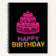 A stylish, spiral-bound notebook with a black cover features a vivid pink birthday cake graphic and bold, gradient "Happy Birthday" text. Ideal for gifts, journaling, and festive celebrations.