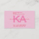 A minimalist monogrammed design in pink and red. It is captioned with name, address, phone, and email.