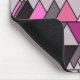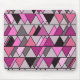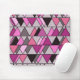 This mouse pad has a mid-century modern design of overlapping triangles running horizontally in pink camo colours on a field of light grey.