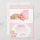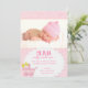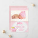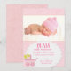 Adorable pink baby carriage and lace pattern designed on custom Baby Girl Photo Birth Announcements. All the text is fully customisable, and it's very easy to change the wordings, typefaces, colours, and sizes of the text.