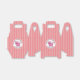 Cute pink kitty cat with black dots for eyes, a black nose and black whiskers. A tiny red love heart is buzzing around near the cats head. The cat is on a white circle with a pink trim. Inside the circle are the words Happy Valentine's Day and Love From Name in curved black lettering. The background is made up of light and dark pink vertical stripes.