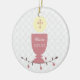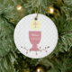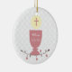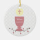 A pretty ornament to commemorate a First Holy Communion. The design features a pink chalice, Eucharist with pink cross with a vine of brown leaves and pink flowers on a white lace look background. Customise with name and date if desired.