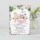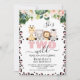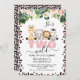 Girl's safari two wild birthday invitation featuring a leopard or cheetah print pattern around the edge and a tropical floral arrangement at the top. This design also features four cute safari animals. Great for a safari two wild themed second girl's birthday party.
