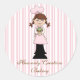 Cute round bakery business stickers done in a pink and white striped background. Adorable graphics of a girl chef, wearing a pink apron and chef hat, is holding a colourful cupcake. Brown script text, on the bottom, is ready to personalise to suit your needs.