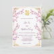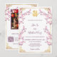 This contemporary Chinese wedding invitation features a golden Asian frame, pink cherry blossoms and a golden artistic double happiness symbol on a white background. With a custom photo and a scannable qr code on the backside.