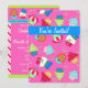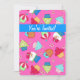 Send a yummy cupcake art invitation for your Christmas open house, party, coffee, or other event with these colourful whimsy cupcakes and the fully customisable fields. The front hasa random design of original art of varous holiday decorated cupcakes including a snowman cupcake, gingerbread cupcake, Christmas tree cupcake and peppermint cupcake and candies, all on a bright pink background with the customisable words "You're Invited". The other side of the invitation features a row of the colourful cupcakes at the top with green and turquoise strips above and below the cupcakes. Peppermint stripes are on each side edge. The customisable fields can be completed, changed or deleted easily to customise for your event. This design is original art by Phyllis Dobbs and comes on coordinating postage stamps, return address labels and more in this store for a sweet Christmas holiday. Fully customisable to personalise.