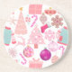 There are several pink Christmas trees adorned with white polka dots and hearts. Around the trees are scattered various ornaments, including candy canes, snowflakes, and presents. Some ornaments are decorated with white polka dots and hearts, while others have intricate patterns like snowflakes or candy swirls. There are also a few pink stockings and reindeer silhouettes adding to the charming Christmas scene.