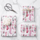 This delightful Christmas wrapping paper captures the spirit of the holidays with charming pink stockings, pine branches, and decorative elements, perfect for showcasing seasonal gifts.