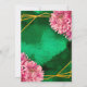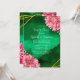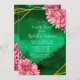 A delicate watercolor illustration featuring a gold geometric frame set against an emerald green background. The frame is adorned with vibrant hot pink chrysanthemums placed along the outer edges. The entire design has a soft watercolor texture, blending elegance with a natural floral touch.