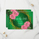 A delicate watercolor illustration featuring a gold geometric frame set against an emerald green background. The frame is adorned with vibrant hot pink chrysanthemums placed along the outer edges. The entire design has a soft watercolor texture, blending elegance with a natural floral touch.