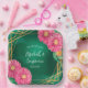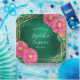 A delicate watercolor illustration featuring a gold geometric frame set against an emerald green background. The frame is adorned with vibrant hot pink chrysanthemums placed along the outer edges. The entire design has a soft watercolor texture, blending elegance with a natural floral touch.