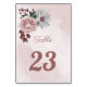 Beautiful botanical table number card featuring romantic pink, white and cinnamon rose/ chianti flowers with green leaves.