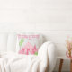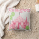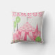 Pink Circus Fun pillow features two pink elephants, one in a party hat, a green ball and balloons, pink striped and polka dotted big top, and text that reads "Circus"!