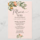 Citrus themed girl's baby shower menu with a pink background. This design features two citrus, floral and foliage arrangements and a calligraphy font heading image that can be removed.