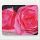 The original photograph by MaeFlowers on this Mousepad is a closeup of two bright pink climbing roses, fresh from the garden. The rose petals, in light and shadow, are many shades of pink, from pale to deep. One rose faces us directly, showing the tips of the petals as they curve around to the centre. The other rose, beside and slightly behind the first, is turned a little to the side. They are resting on a light textured grey surface, against a black background.
