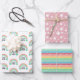 Lucky one birthday wrapping paper sheets with green four leaf clovers and a sparkling rainbow in pretty colours. St Patrick's Day themed first birthday party wrapping paper sheets in pink with a four leaf clover pattern, rainbow stripes, and a lucky one pattern. Colourful pink lucky one birthday party wrapping paper sheets with mixed patterns.