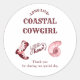 Get ready to celebrate the bride-to-be with our Coastal Cowgirl bachelorette party classic round sticker! The charm of the ocean meets the spirit of the wild west with coastal and western motifs. Perfect for a Tropical Beach Ocean theme or a Western Girl Last Rodeo bash. Whether she's a Coastal Girl or loves pink Coastal Vibes, this thank you sticker has it all. Featuring pink Western Yeehaw Boots and seashell motif, it's ideal for any pink Aesthetic Fun Party. From New Orleans to Nashville, Miami to Charleston, and even Texas and Tennessee, this classic round sticker captures the essence of fun and adventure. Make her last fling unforgettable with this unique and vibrant sticker!