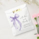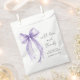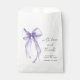 Elegant bridal shower thank you favor bags featuring a light pink watercolor of a delicate coquette bow, "with love and thanks" in a chic script, and the name of the bride and shower date in modern lettering.