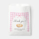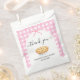 This charming baby shower favor bag features a sweet apple pie design framed by a soft pink gingham border, accented with delicate white flowers and a coquette-style ribbon bow. Elegant script typography adds a heartfelt touch, making it perfect for presenting treats, baked goods, or small gifts for guests. Designed to coordinate seamlessly with a Cutie Pie–themed baby shower collection, this favor bag adds a polished and cohesive finishing detail to your celebration. The soft pastel color palette creates a warm, timeless look suitable for any season, while the customizable text allows you to personalize it with the guest of honor’s name and event date.