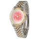 The watch is very nice, the picture is great and the watch looks like quality. The only problem I am having with it is that it is a little too large, and I also can't figure out how to open the clasp. No directions came with it. Very good. The printing is perfect and the watch keeps good time.