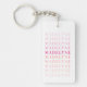 This personalised keychain features a modern typography design with pink and coral text. Customise the text with your name or other text.