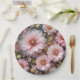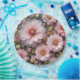 Delicate pink cosmos flowers with thin, translucent petals are clustered together, surrounded by golden leaves on black
