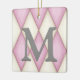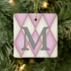 This elegant custom ornament has a large monogram on a Harlequin pattern of pink and cream diamonds. Write your personalized message on the back over a distressed parchment background.