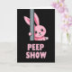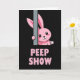 This card features a stylized pink bunny-like creature 🐰 peeking from behind a tall, vertical gray pillar against a deep black background. Its large dark eyes and small upturned smile aim outward with a flirty, friendly look, as if sharing a private joke with the viewer. Soft rosy cheek marks and a tiny paw curled around the pillar add a gentle, inviting touch, while the long pointed ears stand alert. A small white tail peeks from the side, making the pose feel like a shy reveal rather than a loud gag. Near the lower portion, dusty-pink sans-serif text reads “PEEP SHOW,” centered and easy to spot. The lettering has a lightly worn texture that contrasts with the smooth, simple shapes above, and the pink and gray colors stand out sharply on the black field 🌷. The bunny’s paw grips the right edge of the pillar while its face and ears lean into view from the left.