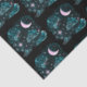 This Halloween-themed tissue paper features a captivating design that evokes the enchanting beauty of a mystical night sky. Against a striking black background, a pink crescent moon shines brightly, its delicate hue contrasting beautifully with the darkness of the night. Surrounding the moon, wispy clouds in shades of green and grey drift across the paper, creating a sense of movement and depth.