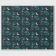 This Halloween-themed wrapping paper features a delightful design that evokes a mystical, nighttime ambiance. Against a vibrant blue background, a pink crescent moon takes centre stage, casting a gentle glow over the scene. Surrounding the moon, soft green and grey clouds drift lazily, creating a sense of depth and movement in the sky. Twinkling among the clouds are stars in shades of green and pink, adding a touch of whimsy and magic to the design.