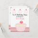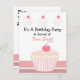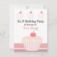 A sweet birthday invitation featuring a row of cupcakes across the top. A large cupcake with a pink liner and pink frosting topped with a cherry accents the bottom. Pink stripes also accent the bottom. Customize with all of your birthday information as desired.