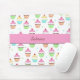 This mouse pad is done in pastel colours with pink being the main colour. It has colourful little cupcakes all over it. A pink stripe runs through the centre with custom text inside it.