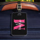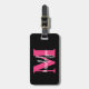 Create Your Own Stylish Modern Custom World Traveller Girly Black and Hot Pink Name Monogram Luggage Tag. This bold and chic luggage tag adds a fun and personalised touch to any travel adventure, perfect for the world traveller or anyone who loves a little glam on the go. The front features a hot pink magenta serif initial set against a sleek black background, with your name in white handwritten script layered across the centre for a modern, girly vibe.